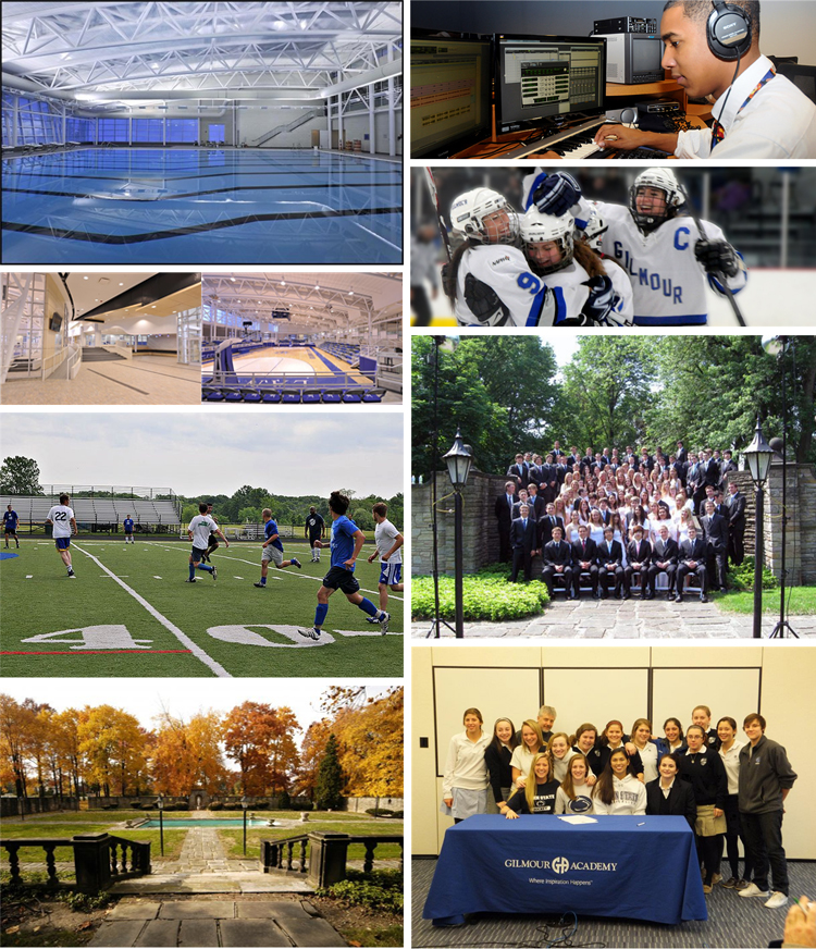 | 학교소개 | Gilmour Academy는 Gates Mills, Ohio에 위치하고 있으며, Cleveland 시내 동쪽에서 18 miles 떨어져 있다. Cleveland 는 미국 중심부에 위치한 매우 중요한 도시입니다. Cleveland에는 Cleveland Art Museum, Rock and Roll Hall of Fame, Museum of Natural History 박물관 등이 있습니다. 학업 프로그램으로는 14개의 AP 과목을 제공합니다. 그리고 KAP(Kenyon Academic Partnership)를 통하여 담당 선생님의 추천을 받은 높은 성적의 학생들은 Kenoyn 대학교의 수업을 들을 수 있으며, 현재 50명 이상의 학생이 이 수업을 듣고 있습니다. 전체 커리큘럼의 영어, 외국어, 사회, 수학, 과학, 종교 수업과 Honors level의 수업으로 Gilmour Academy에서 방송저널리즘, 신문 저널리즘, 시각예술, 중국어, 아랍어, 기초 함수, 해양물리학, 생명공학, 기초 건축학, 패션디자인의 과목의 수업을 제공합니다. Catalyst Program은 리서치 바탕의 한 학기 학외 연수 프로그램으로 학생들이 병원, 박물관, Case Western대학교의 멘토와 함께 관심분야의 리서치를 합니다. 최근에는 분자생물학, 공학, 심리학, 컴퓨터과학, 천체물리학, 예술 보존 관리 분야로 늘어났습니다. 학교는 국제학생들을 위해 국제학생 학업지원 프로그램을 제공합니다. 학교에 지원한 국제학생들에게 높은 영어실력을 요구하며, TOEFL시험을 보도록 권장하고 있습니다. 특별활동으로는 40개의 클럽, 특별활동, 15개의 스포츠 활동에 참여할 수 있습니다. SAT 평균점수는 1704점으로 졸업생의 대학진학률은 100% 입니다. 졸업생이 진학한 대학은 다음과 같습니다. Brown University, Carnegie Mellon University, Case Western University, University of Chicago, Columbia University, Cornell University, Dartmouth College, Duke University, Emory University 등. |
